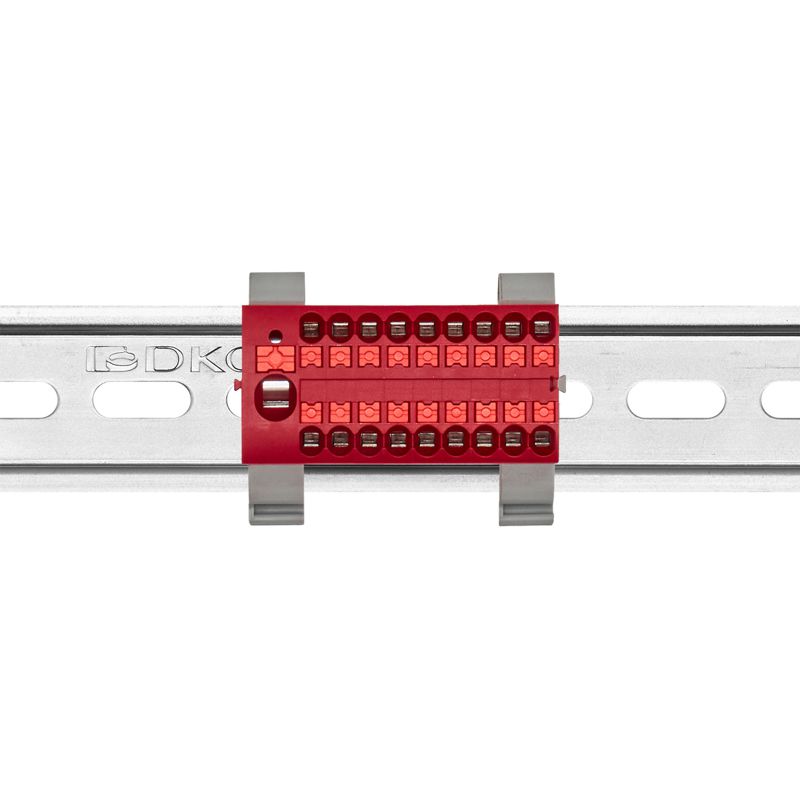 - Блок распределительный с горизонт. адаптером на рейку шир. 35мм зажим push-in 1 ввод 6кв.мм 18 точек подключения 2.5кв.мм красн. DKC DTP1-118-104SPUR-H
