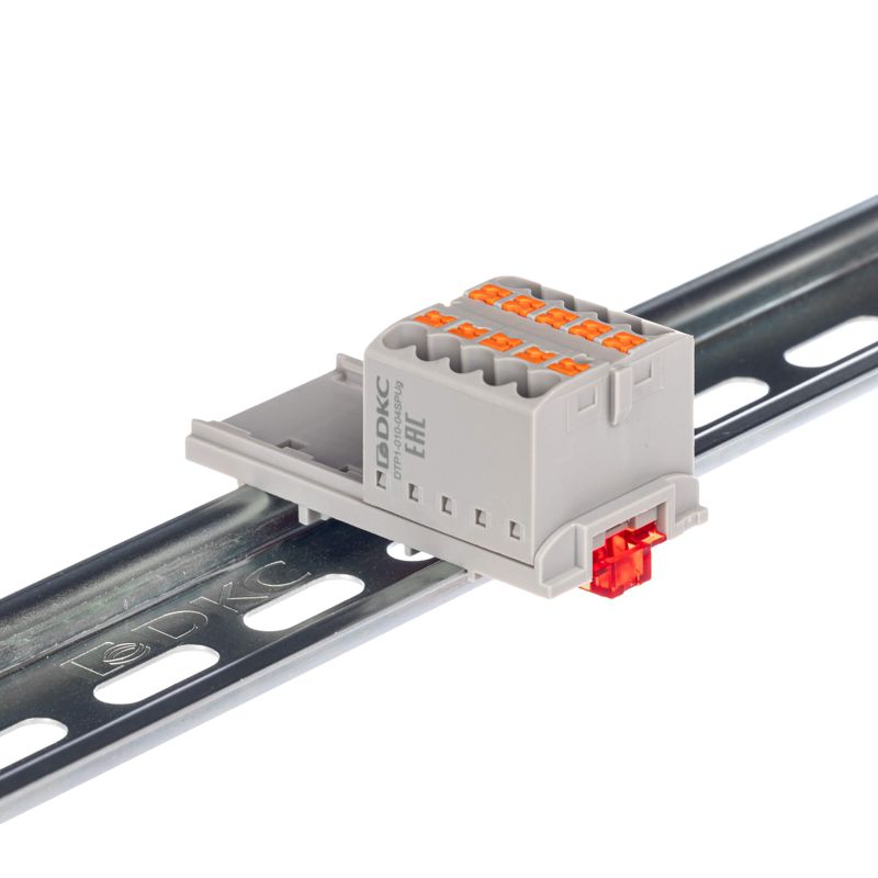 - Блок распределительный с вертикал. адаптером на рейки шир. 15/35мм зажим push-in 10 точек подключения 2.5кв.мм сер. DKC DTP1-010-04SPUG-V