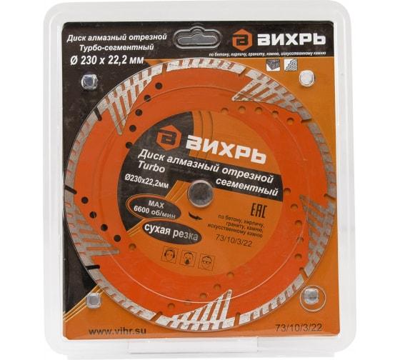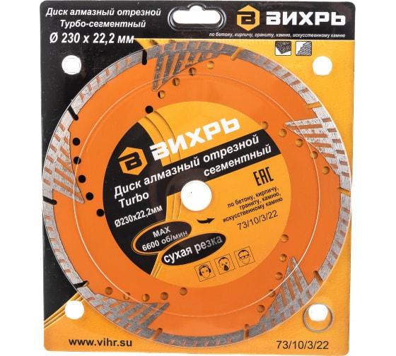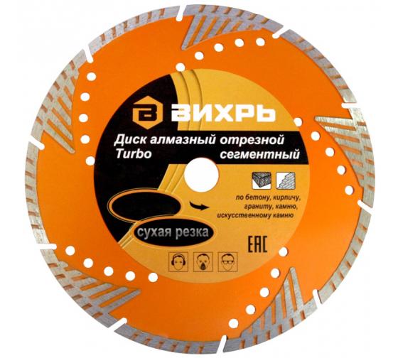 - Диск отрезной алмазный сегментный Турбо 230х22.2мм сухая резка Вихрь 73/10/3/22