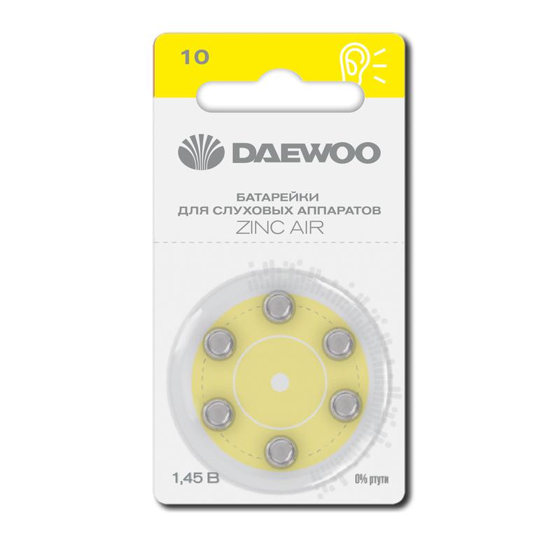 - Элемент питания воздушно-цинковый ZA10/PR70 1.45В BL-6 (блист.6шт) для слуховых аппаратов DAEWOO 5060333