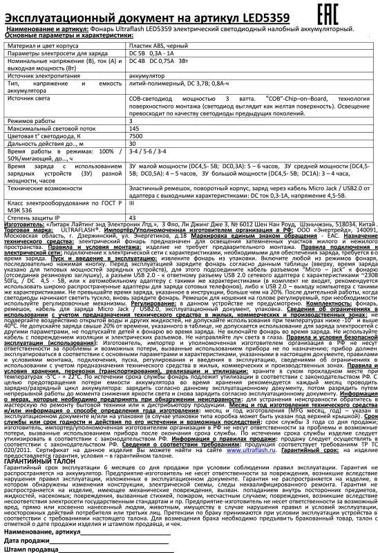 - Фонарь аккумуляторный налобный LED5359 COB 3Вт 3 режима аккум. 5В пластик. черн. (бокс) Ultraflash 13803