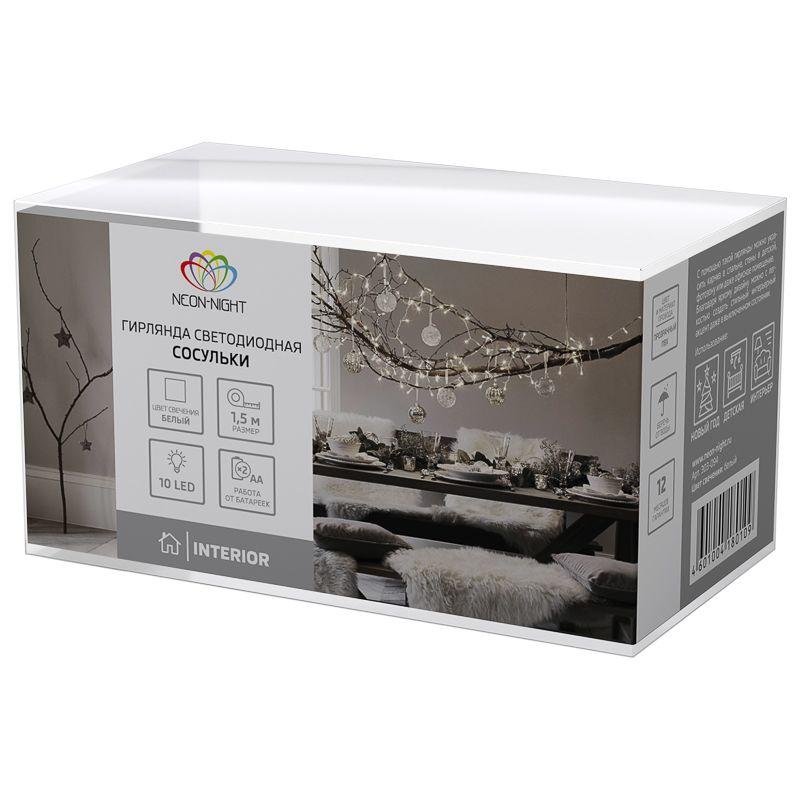 - Гирлянда светодиодная "Сосульки" 1.5м 10LED бел. 0.1Вт IP20 провод ПВХ прозр. элементы питания 2хAA (не в компл.) Neon-Night 303-094