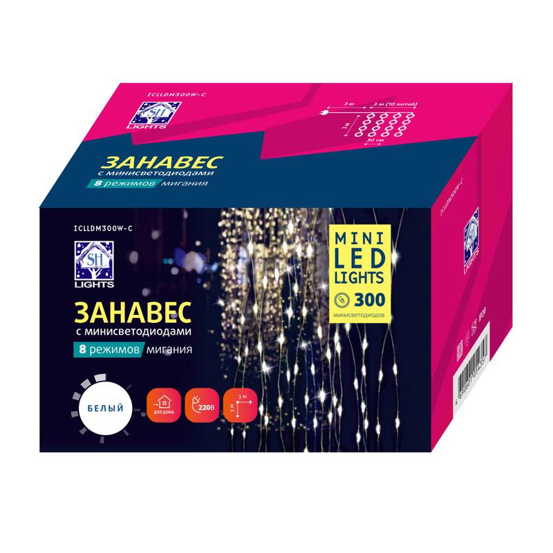 - Гирлянда "Занавес" ICLLDM300W-C 300LED LED 3х3м 8режимов IP20 бел. SHLights 4690601054357