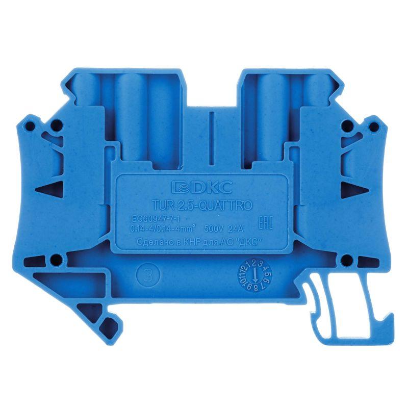 - Клемма проходная винтовой зажим 4 точки подключения 2.5кв.мм син. DKC TUR-2.5-QUATTRO-BU
