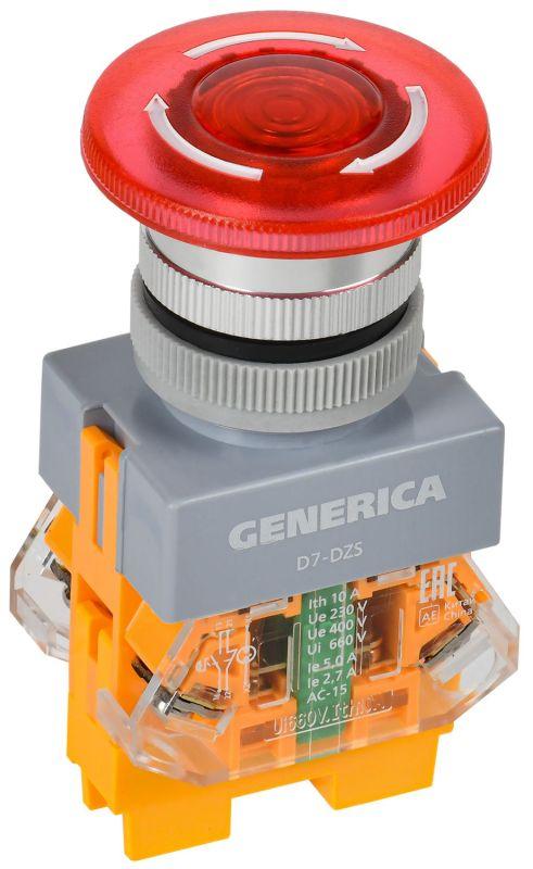 - Кнопка D7-DZS "Грибок" d22мм 1НО+1НЗ поворотн. с подсветкой и фиксацией красн. GENERICA BBG50-11DZS-3-11-K04-G