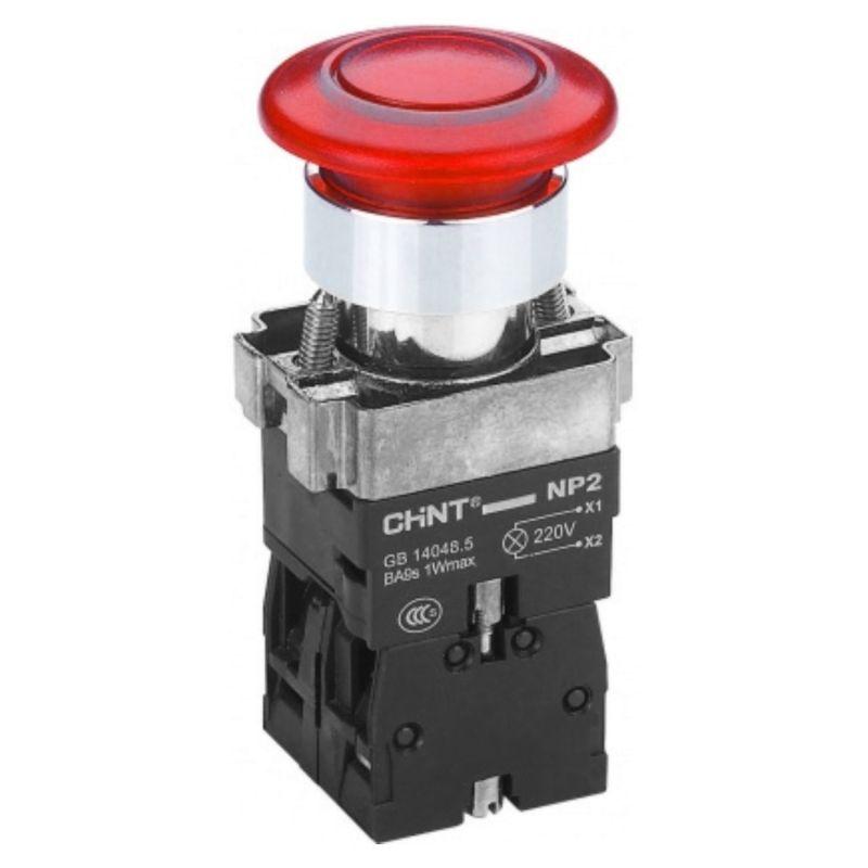 - Кнопка управления "Грибок" d40мм NP2-BW4462 1НЗ IP40 с самовозвратом с подсветкой красн. (R) CHINT 575782