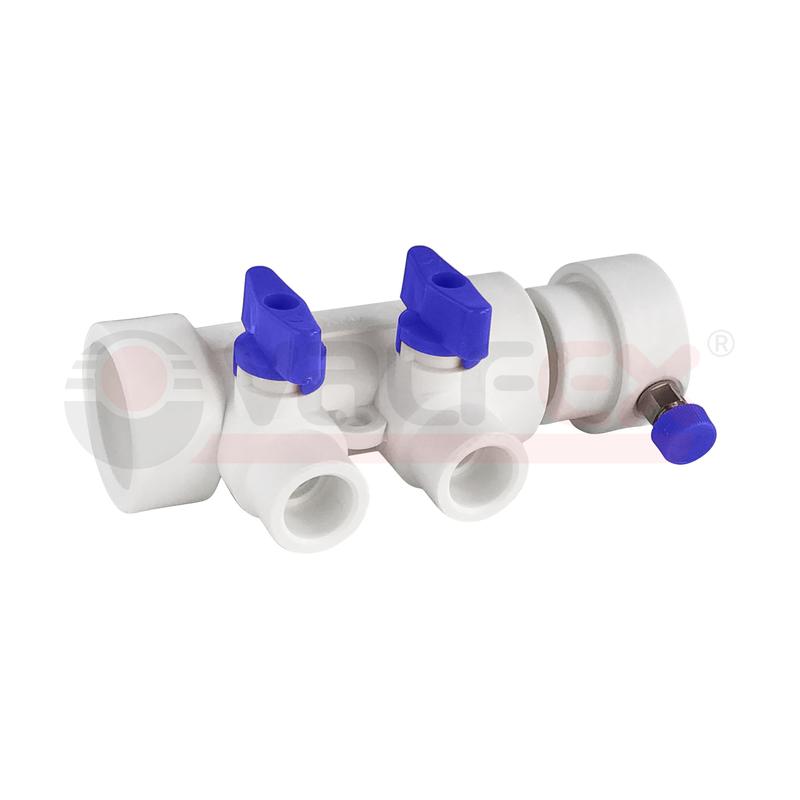 - Коллектор PPR с отсечными син. кранами и воздух-ком 40х20 7 выходов (20/1) бел. K VALFEX 111134007