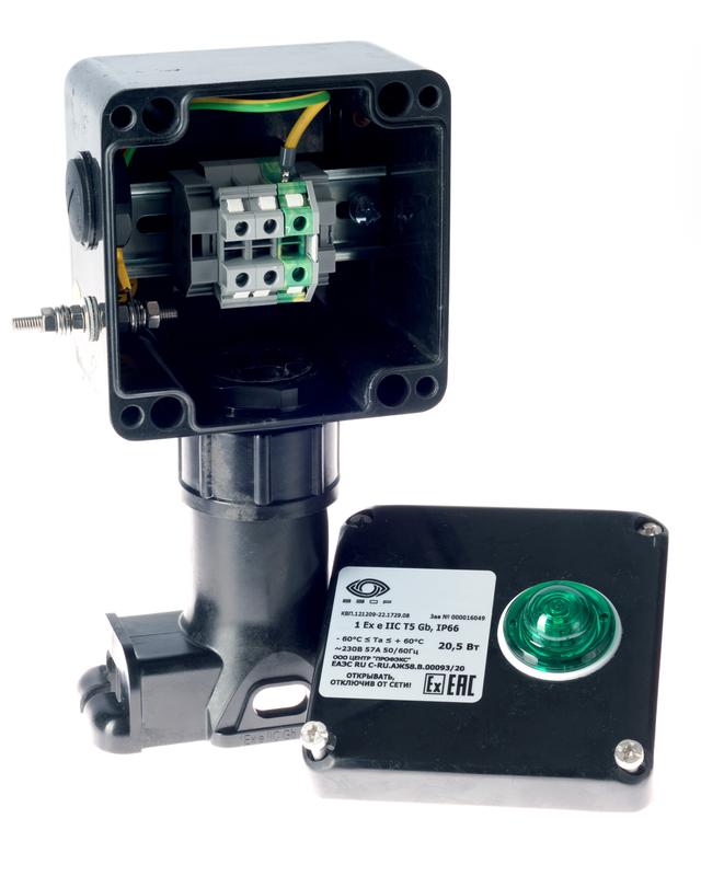 - Коробка клеммная взрывозащ. с индикацией питания КВП на пластик. опоре для подключ. или концев. заделки нагреват. секции 1 отверст. под М25 клеммн. колодка 3мод. 10кв.мм Extherm sborka 1P/1L