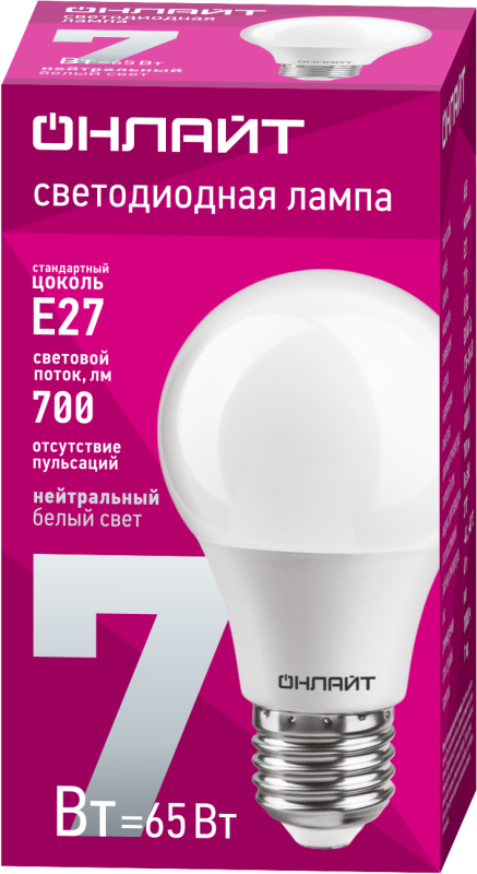 - Лампа светодиодная 71 648 OLL-A60-7-230-4K-E27 7Вт грушевидная 4000К нейтр. бел. E27 700лм 176-264В ОНЛАЙТ 71648