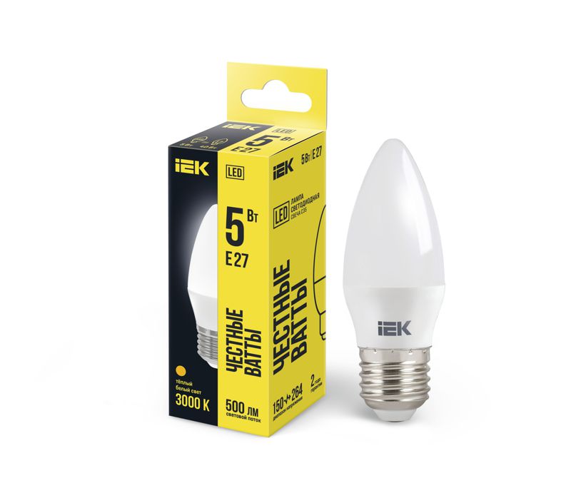 - Лампа светодиодная C35 5Вт свеча 3000К тепл. бел. E27 450лм 230-240В IEK LLE-C35-5-230-30-E27