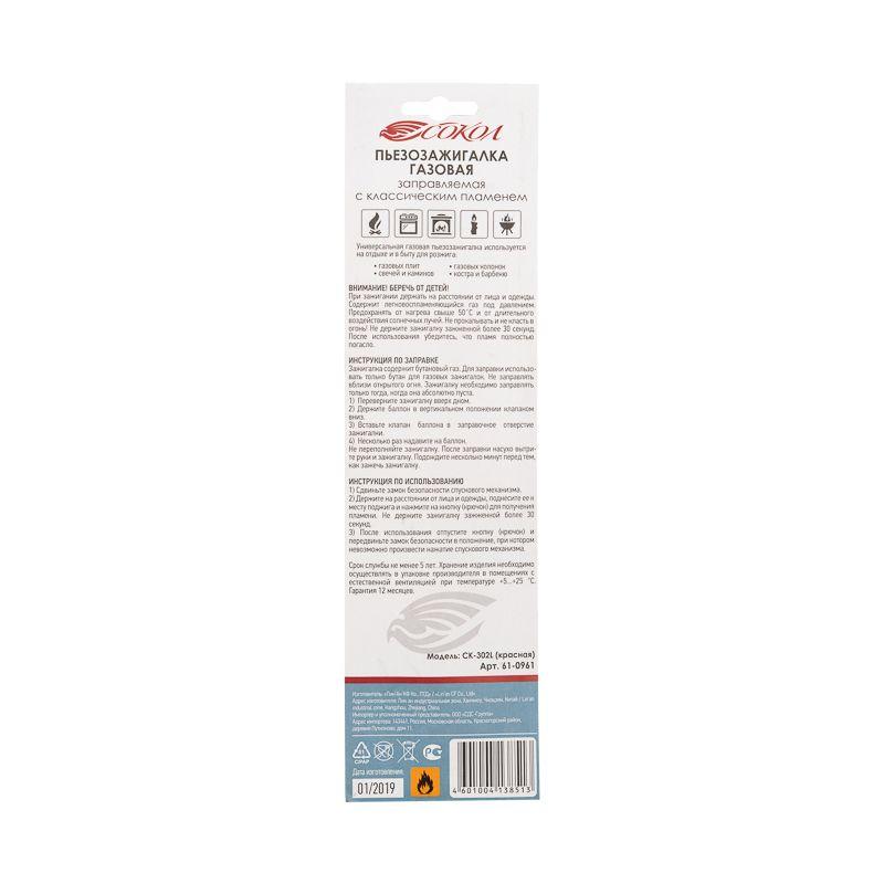- Пьезозажигалка газовая СК-302L бытовая с классическим пламенем многоразовая красн. СОКОЛ 61-0961