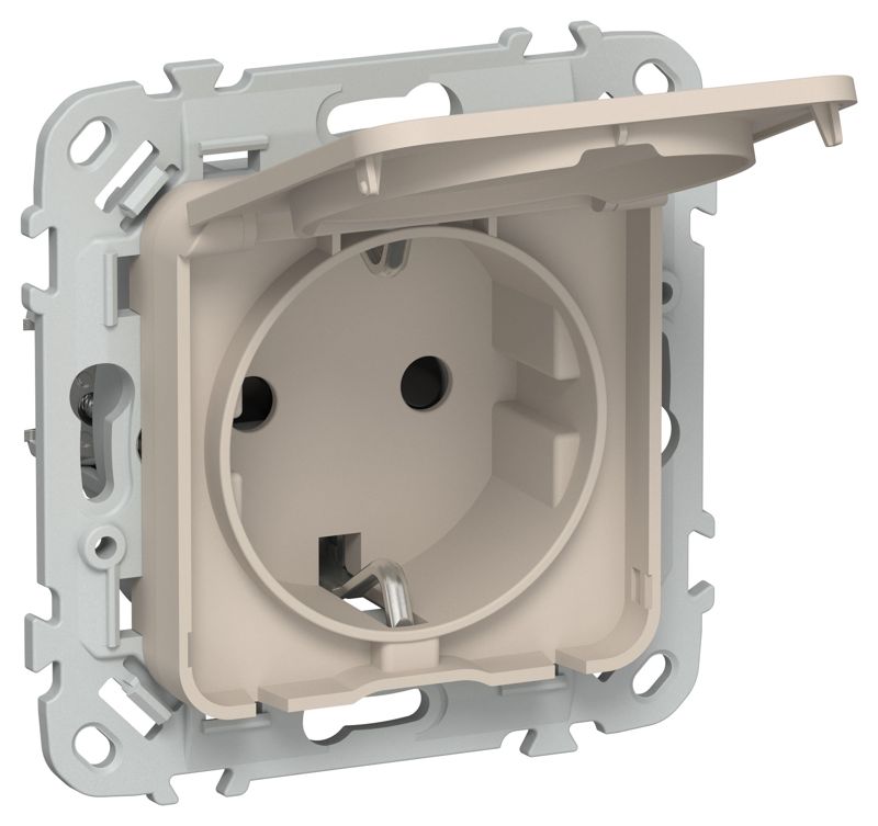 - Розетка СП FLITE РСшкр11-1-44-ФлЛ 16А IP44 с заземл. с защ. шторками и крышкой безвинтовое крепление механизм льняной IEK FI-R16-16-1-44-K88