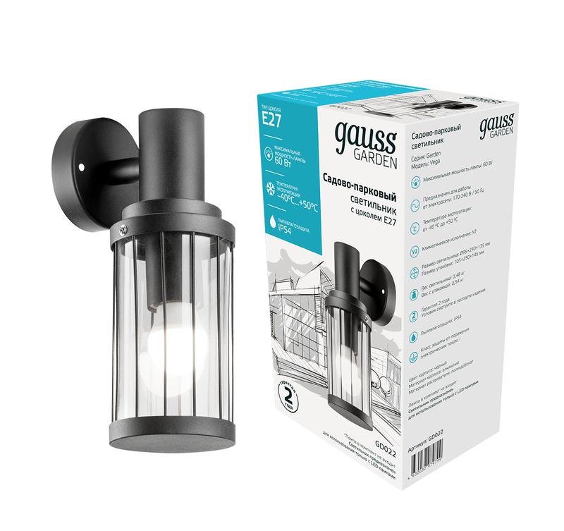 - Светильник садово-парковый Vega на стену вниз 10.5х24х14.2см 170-240В/50Гц 1xE27 Max. 60Вт IP:54 1/24 Gauss GD022
