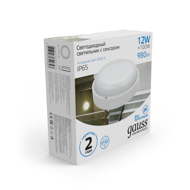 - Светильник светодиодный Elementary 12Вт 6500К IP65 980лм d140х48мм ДБП круг настенно-потолочный с оптико-микроволнов. датчиком GAUSS 126411312-S
