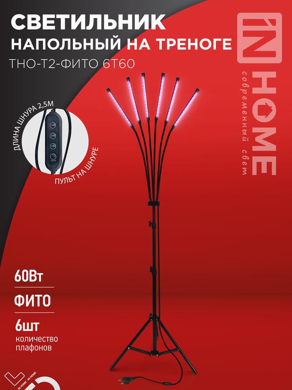 - Светильник светодиодный ТНО-Т2-ФИТО 6Т60 60Вт 6 плафонов напольн. на треноге пульт на шнуре черн. IN HOME 4690612053578