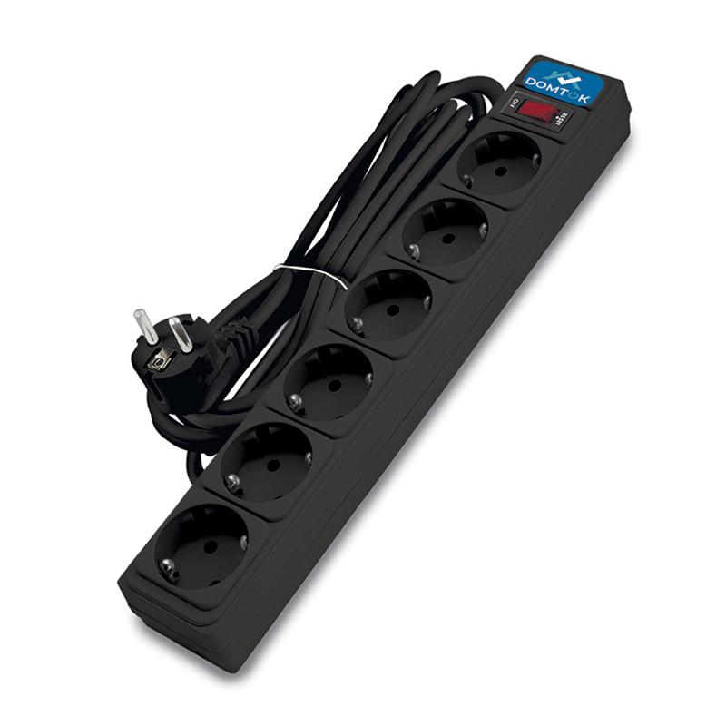 - Удлинитель с сетевым фильтром 6х5м с заземл 10А IP20 2.2кВт ПВС 3х1 с выкл. черн. DOMTOK 2523