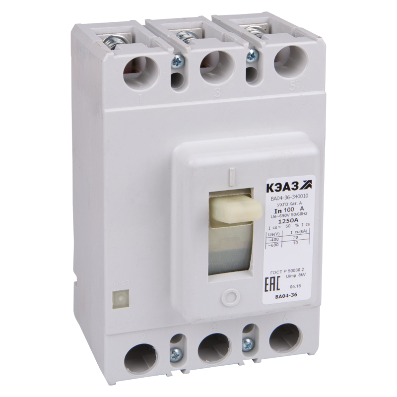 - Выключатель автоматический 3п 100А 1250Im 20кА ВА04-36-340010 УХЛ3 690В AC КЭАЗ 107540