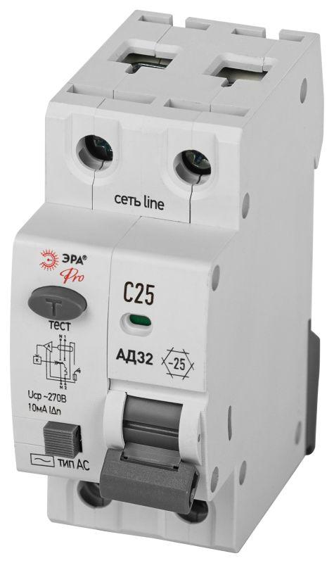- Выключатель автоматический дифференциального тока 1P+N C 25А 10мА тип AC защита 230В АВДТ 4.5кА PRO D32E2C25AC10P АД32 электронное Эра Б0057362