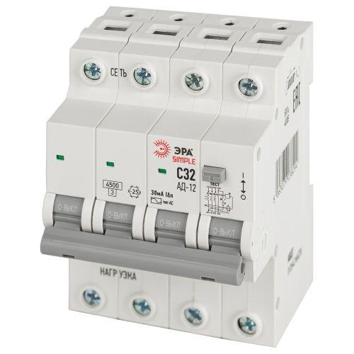 - Выключатель автоматический дифференциального тока 3P+N C 32А 30мА тип АС 4.5кА АД-12 электронное SIMPLE D12E4C32AC30 Эра Б0058929