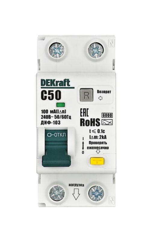 - Выключатель автоматический дифференциального тока (АВДТ) 1P+N 50А 100мА AC х-ка C ДИФ-103 6кА DEKraft 16325DEK