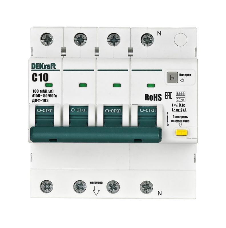 - Выключатель автоматический дифференциального тока (АВДТ) 3P+N 10А 100мА AC х-ка C ДИФ-103 6кА DEKraft 16409DEK