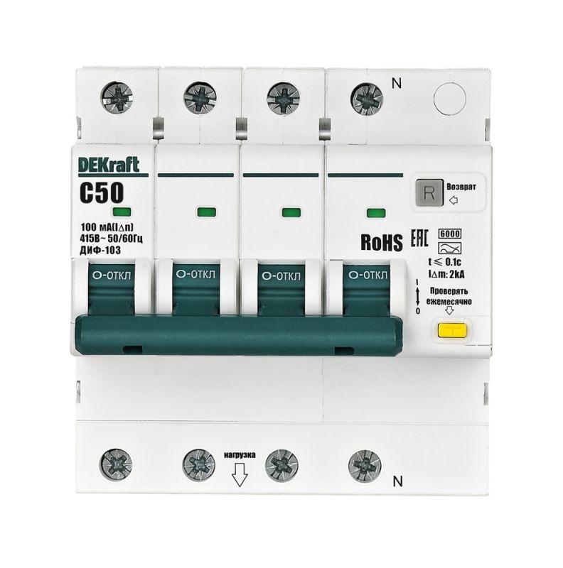 - Выключатель автоматический дифференциального тока (АВДТ) 3P+N 50А 100мА A х-ка C ДИФ-103 6кА DEKraft 16442DEK