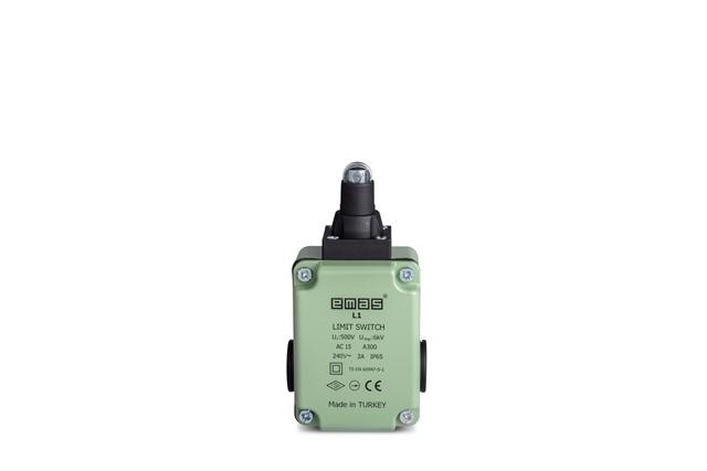 - Выключатель концевой медленного переключения линейный 3-х направленный с пластмас. консолью и стальным плунжером и роликок Ф13мм (1НО+1НЗ) EMAS L1K23MUM331